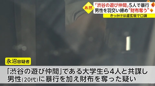 永沼容疑者は、渋谷の遊び仲間である大学生ら4人と共謀し、20代の男性に暴行を加え、現金などが入った財布を奪った疑いが持たれている。