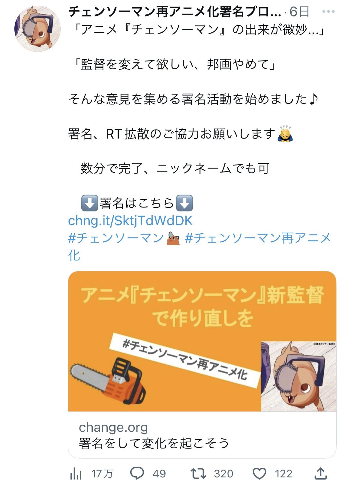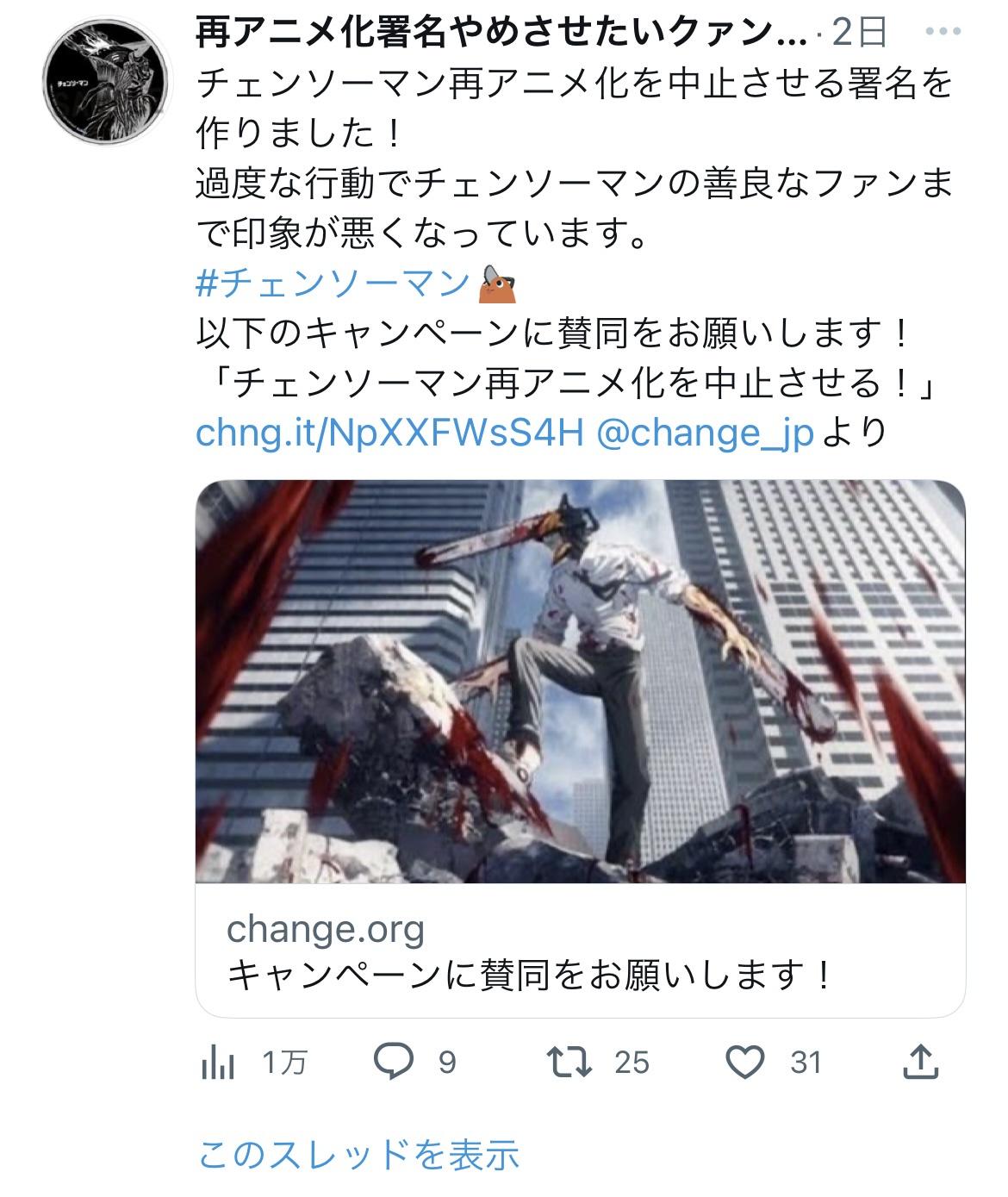 【悲報】チェンソーマン界隈、もうめちゃくちゃ Twitter Facebook はてブ LINE コピー 2022.12.24 スポンサーリンク 1: それでも動く名無し 2022/12/23(金) 21:02:03.06 ID:tXufkQLe0 チェンソーマン再アニメ化の署名活動が始まる 今度はチェンソーマン再アニメ化の署名活動をやめさせる署名活動が始まる 13: それでも動く名無し 2022/12/23(金) 21:04:56.53 ID:aM20WTMQ0 これはファンなのかアンチなのか🤔 15: それでも動く名無し 2022/12/23(金) 21:05:02.23 ID:mWIBpzvk0 地獄で草 続きを読む