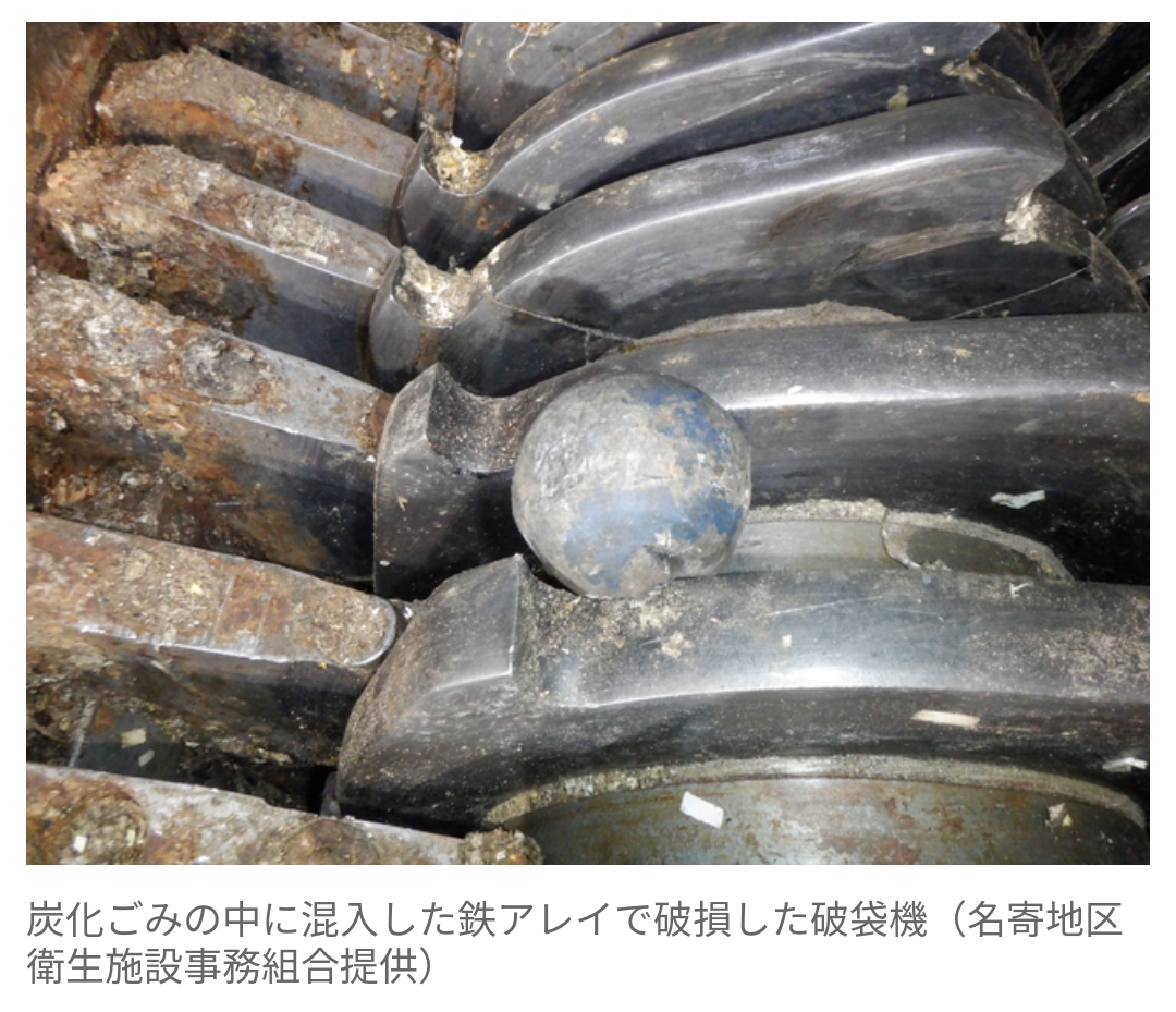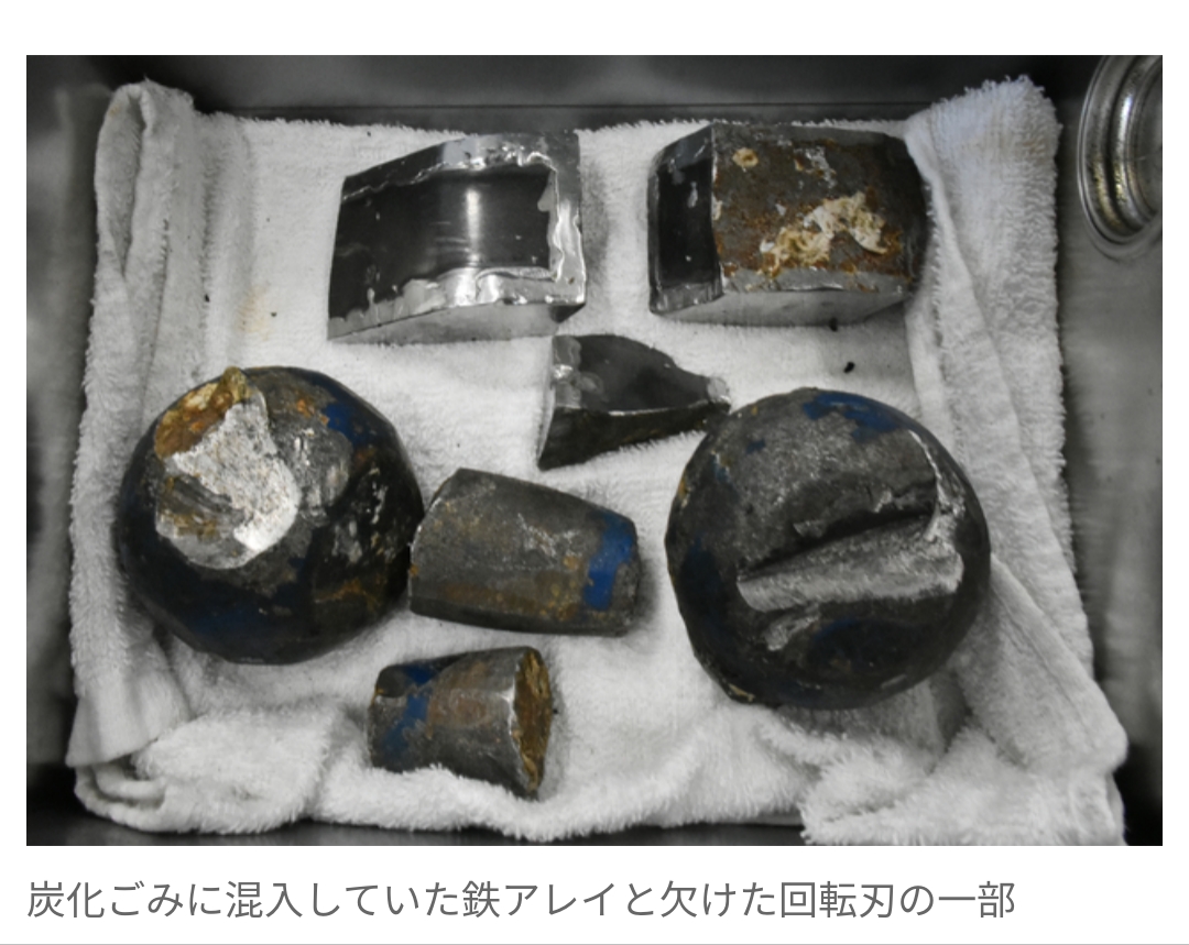 同組合によると、13日午後7時半ごろ、ごみ袋を破る機械「破袋機(はたいき)」の回転刃が破損し、処理が停止。職員が調べると、中にバラバラになった鉄アレイが見つかり、刃に亀裂が入り、一部は欠けていた。