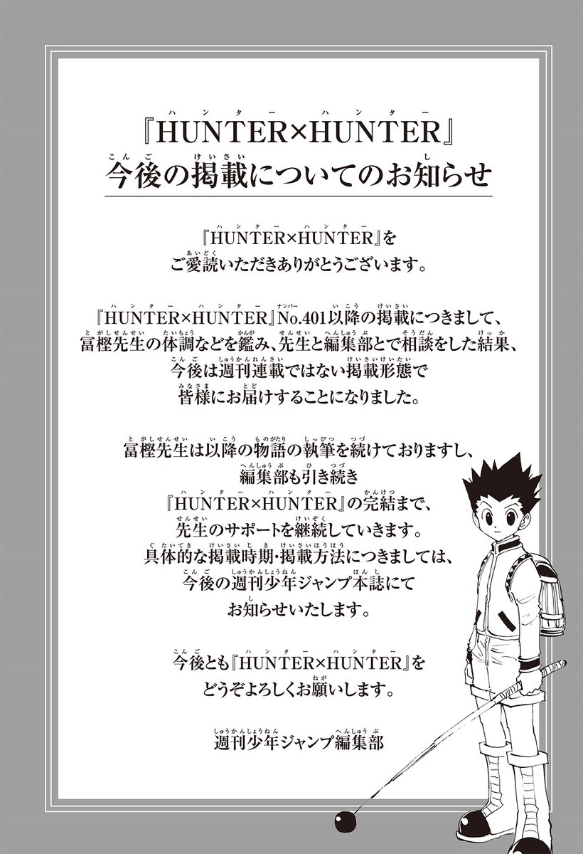 『HUNTER×HUNTER』今後の掲載についてのお知らせ pic.twitter.com/UymYkZYiv0