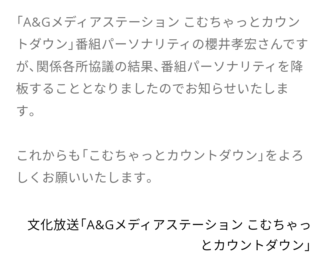 【発表】声優・櫻井孝宏『こむちゃっとカウントダウン』パーソナリティを降板https://t.co/pl9AE5UtWs