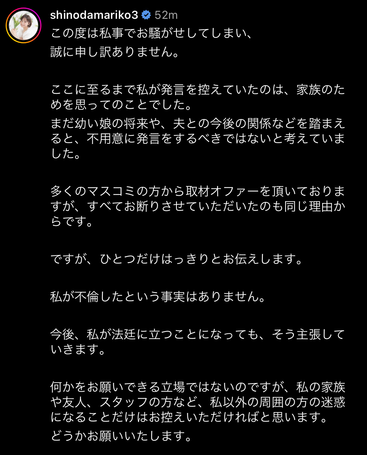 篠田麻里子、声明発表「私が不倫したという事実はありません」 Twitter Facebook はてブ LINE コピー 2022.12.28 スポンサーリンク 1: それでも動く名無し 2022/12/28(水) 18:19:27.80 ID:RFvS2uLIM https://www.instagram.com/p/CmtK96dB5WD/?igshid=MDJmNzVkMjY%3D 関連記事【地獄】篠田麻里子さんの音声データ、無事流れる 4: それでも動く名無し 2022/12/28(水) 18:20:31.65 ID:YbO2DrlJM 開き直り路線か 10: それでも動く名無し 2022/12/28(水) 18:21:39.53 ID:UHso+ip80 音声あるのにそこ否定するの斬新すぎる 続きを読む