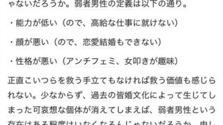 【画像】女性「どうすれば弱者男性を救えるか考えたけど、こいつら救う手立ても価値もないと気づいた」 Twitter Facebook はてブ LINE コピー 2022.12.30 スポンサーリンク 1:風吹けば名無し:2022/12/30(金) 21:31:43.67 ID:cg/YAWIj0.net 2:風吹けば名無し:2022/12/30(金) 21:31:52.44 ID:cg/YAWIj0.net 酷すぎる 3:風吹けば名無し:2022/12/30(金) 21:32:07.27 ID:cg/YAWIj0.net ワイらは哀れなモンスターかよ 続きを読む