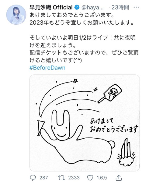 【画像】声優の早見沙織さん、新年のご挨拶 Twitter Facebook はてブ LINE コピー 2023.01.03 スポンサーリンク 1:以下、5ちゃんねるからVIPがお送りします:2023/01/02(月) 13:46:02.718 ID:tQuKrII8d 3:以下、5ちゃんねるからVIPがお送りします:2023/01/02(月) 13:47:25.791 ID:dHKlAomaa 味のある画風しているね(白目) 4:以下、5ちゃんねるからVIPがお送りします:2023/01/02(月) 13:47:56.971 ID:2p7ItgPS0 ワロタ 続きを読む