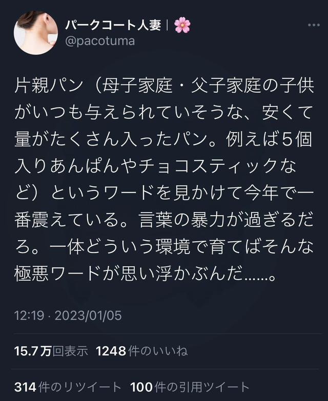 片親パン(母子家庭・父子家庭の子供がいつも与えられていそうな、安くて量がたくさん入ったパン。例えば5個入りあんぱんやチョコスティックなど)というワードを見かけて今年で一番震えている。言葉の暴力が過ぎるだろ。一体どういう環境で育てばそんな極悪ワードが思い浮かぶんだ……。