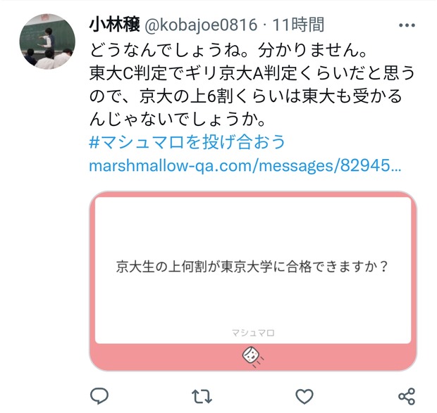 東大C判定でギリ京大A判定くらいだと思うので、京大の上6割くらいは東大も受かるんじゃないでしょうか。#マシュマロを投げ合おうhttps://t.co/UgoDirudsm pic.twitter.com/J46zd2WIVI