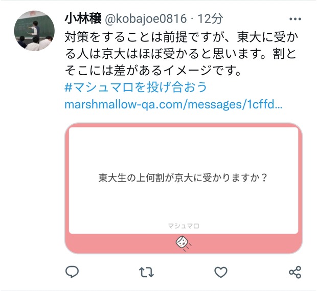 対策をすることは前提ですが、東大に受かる人は京大はほぼ受かると思います。割とそこには差があるイメージです。#マシュマロを投げ合おうhttps://t.co/Hm6y3sV2yV pic.twitter.com/7bIxRsxjV4