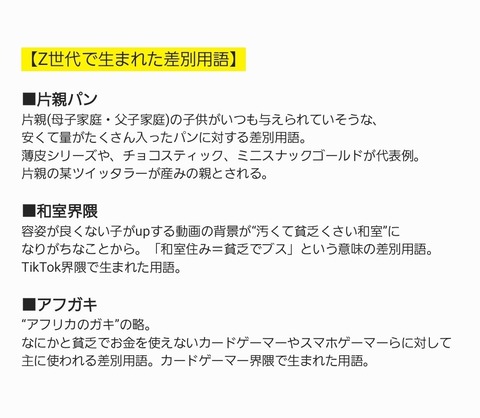 Z世代が生み出した差別用語、エグすぎるwwwwwwwwwww Twitter Facebook はてブ LINE コピー 2023.01.06 スポンサーリンク 1:以下、5ちゃんねるからVIPがお送りします:2023/01/06(金) 17:26:01.336 ID:gPN0KFxGp 悪意がストレートすぎんよー 2:以下、5ちゃんねるからVIPがお送りします:2023/01/06(金) 17:29:29.757 ID:DFPtcjEhp Z世代を名乗るインターネット老人だろこんなん 3:以下、5ちゃんねるからVIPがお送りします:2023/01/06(金) 17:38:47.698 ID:EVkLtl0Ja 美しい国日本 続きを読む