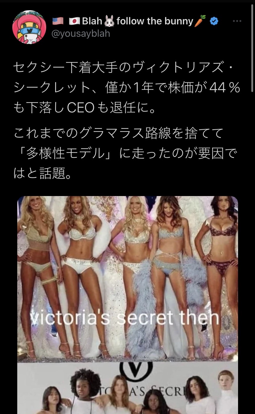 【画像】米セクシー下着大手のヴィクトリアズ・シークレットさん、多様性を重視した結果凄いことにwwwwwwwwwww Twitter Facebook はてブ LINE コピー 2023.01.07 スポンサーリンク 1:アジアゴールデンキャット(茸) [US]:2023/01/07(土) 11:43:32.58 ID:zoGssuC50 BE:271912485-2BP(1500) ソース 2:カナダオオヤマネコ(茸) [ニダ]:2023/01/07(土) 11:46:54.62 ID:yPENL93U0 ひょっこりはん 続きを読む