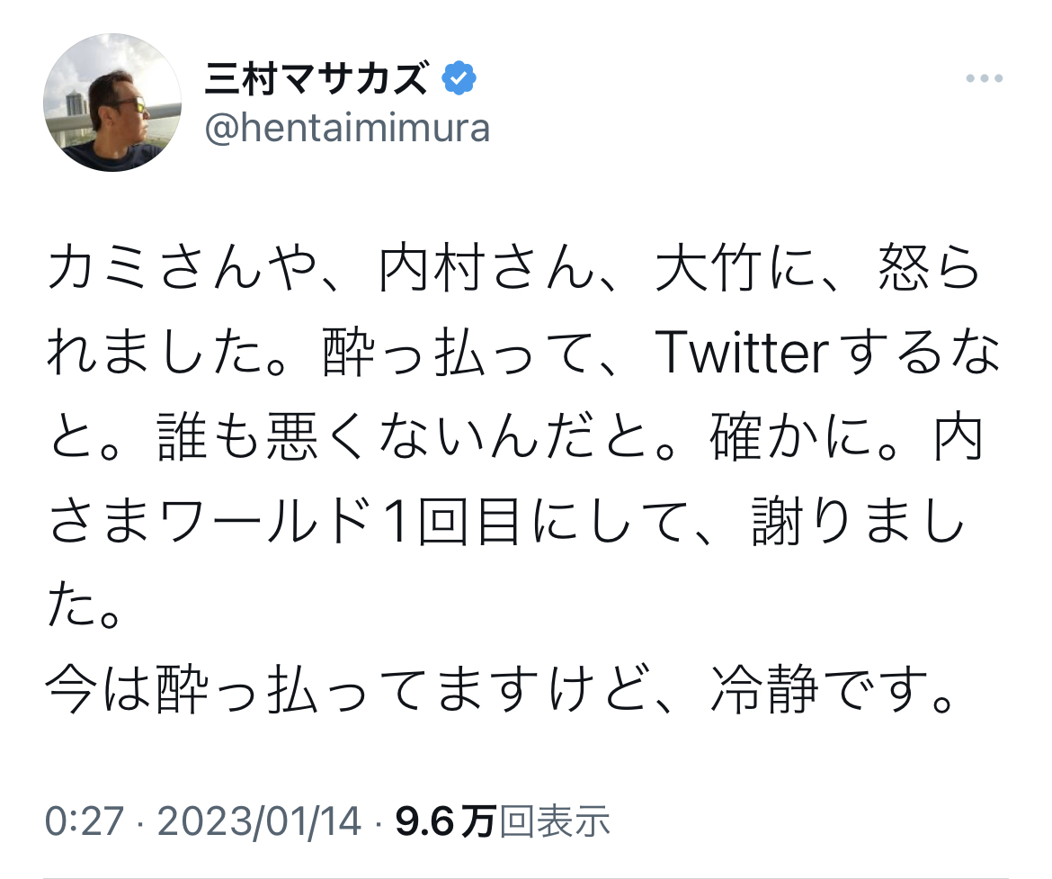 さまぁ~ず三村さん、酔っ払ってTwitterやって相方やウッチャンに怒られる Twitter Facebook はてブ LINE コピー 2023.01.14 スポンサーリンク 1: それでも動く名無し 2023/01/14(土) 01:37:00.23 ID:7yIlZzqF0 アホすぎて草 関連記事三村マサカズさん、突如ぶちギレてTwitter引退宣言 36: それでも動く名無し 2023/01/14(土) 01:52:02.64 ID:vAkSapeZ0 何があったん? 41: それでも動く名無し 2023/01/14(土) 01:54:30.07 ID:K8tKPK2i0 >>36 新番組の番宣したらリプきて面倒くさくなってキレた 続きを読む