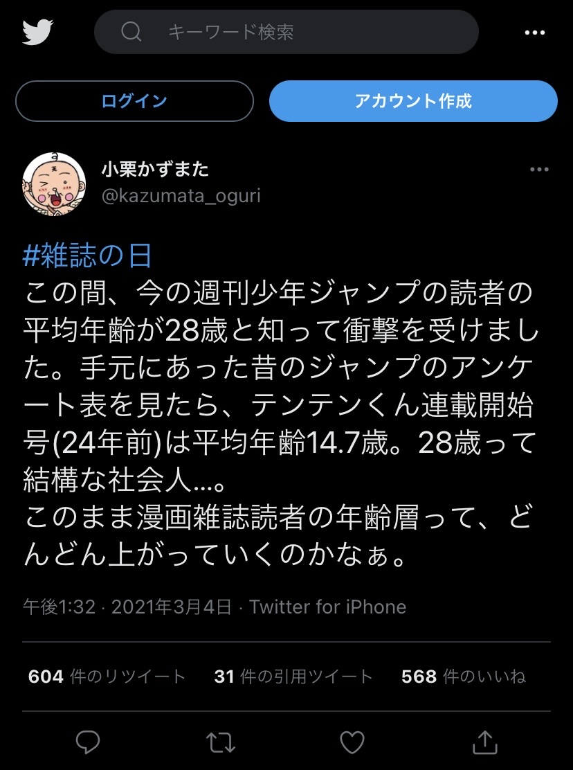 元ジャンプ作家「今の読者の平均年齢が28歳と知り衝撃を受けた。自分の頃は14歳だったのに…」 Twitter Facebook はてブ LINE コピー 2023.01.14 スポンサーリンク 1: それでも動く名無し 2023/01/14(土) 02:35:16.01 ID:46SyHCAY0 4: それでも動く名無し 2023/01/14(土) 02:35:59.38 ID:4JFRwGH/M 自己申告でそれやから 本当はもっと上やな 7: それでも動く名無し 2023/01/14(土) 02:36:35.37 ID:46SyHCAY0 若返りするためにハンターハンターを切ったんか…… 続きを読む