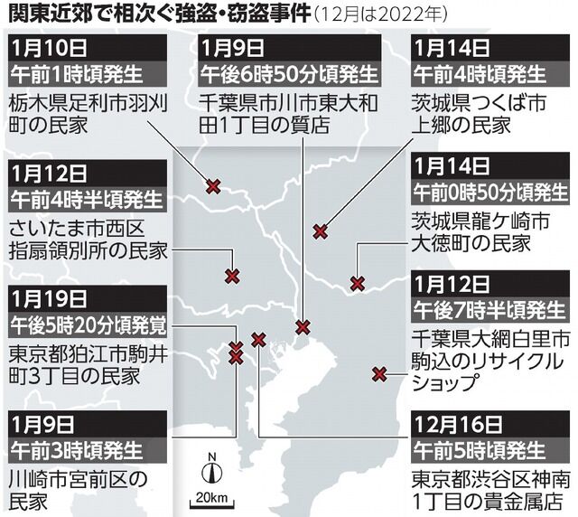 関東周辺では強盗事件が相次いでおり、警視庁は背後に広域の強盗グループが存在する可能性があるとみて、関連を調べている。