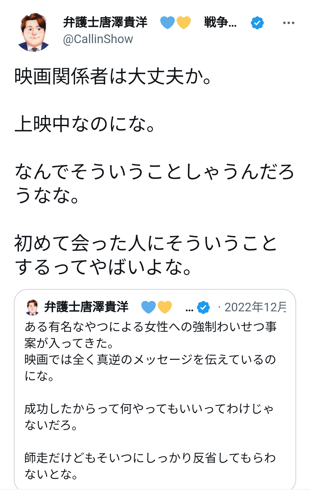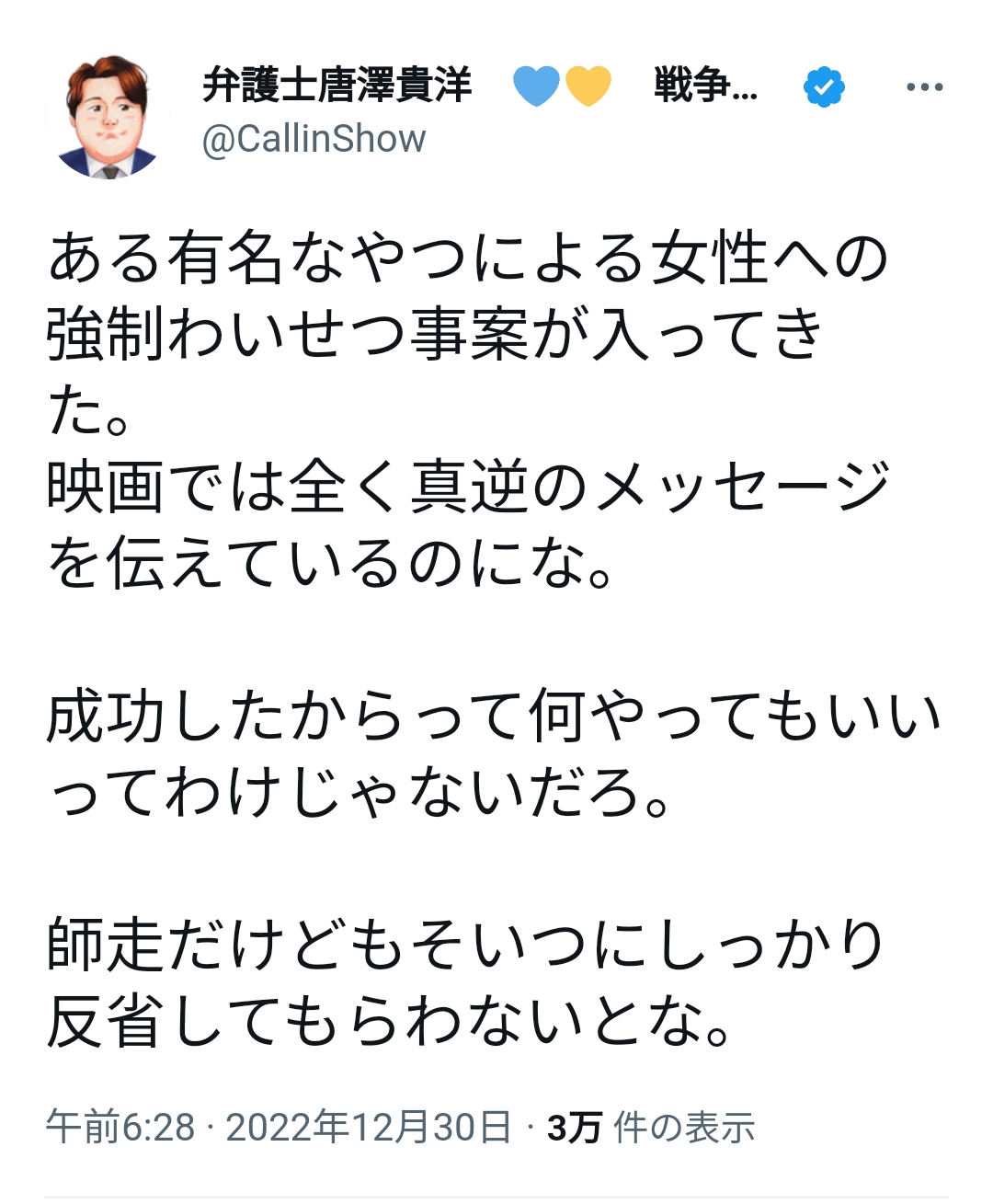 「結局、A子さんは知人でありネット炎上に強いことで有名な唐澤貴洋弁護士に頼りました。年末、唐澤弁護士は山田先生に対し、100万円の慰謝料を払うよう連絡したそうです」(別のイベント関係者)
