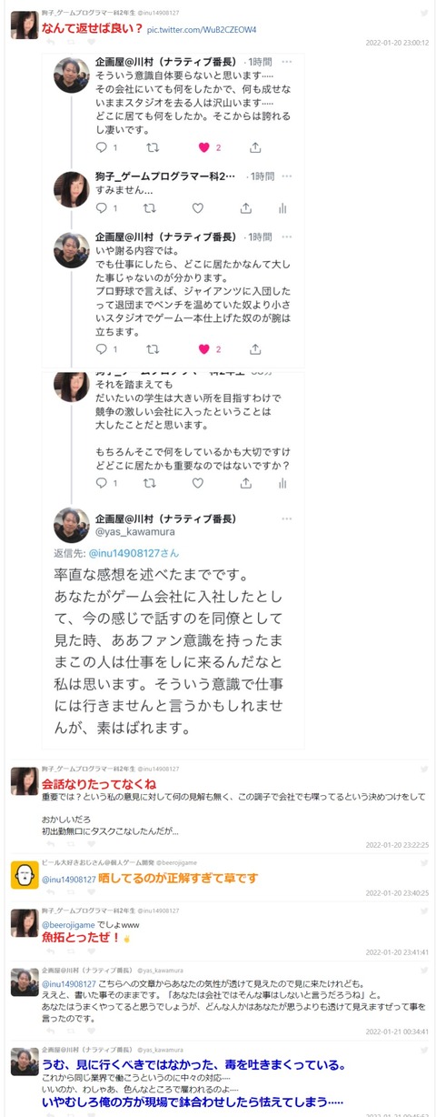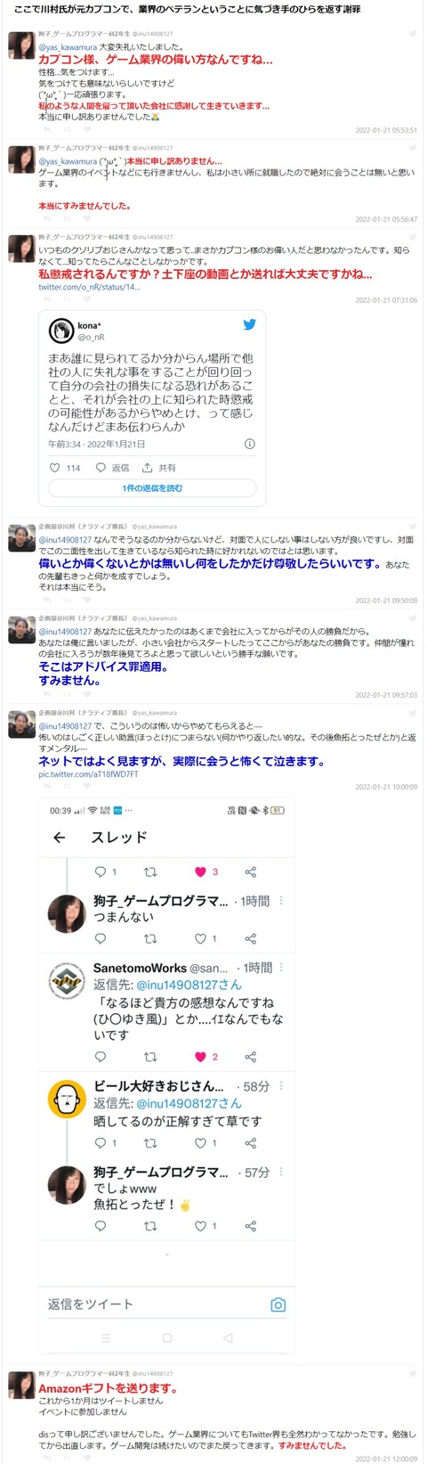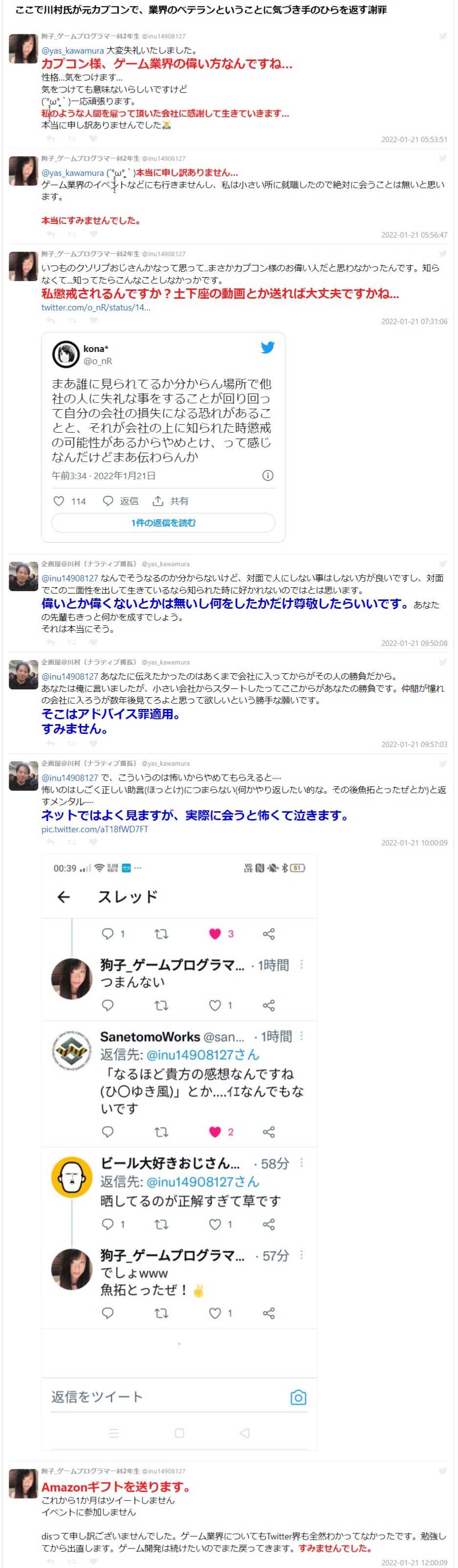 女「クソリプ親父晒したろw」→業界のベテランでした→女「アマギフあげるから許して😭」 Twitter Facebook はてブ LINE コピー 2022.01.26 スポンサーリンク 1:風吹けば名無し:2022/01/26(水) 06:08:53.43 ID:nLT0PFhg0.net サイコホラーやろこら 狗子_ゲームプログラマー科2年生 @inu14908127 いつものクソリプおじさんかなって思って..まさかカプコン様のお偉い人だと思わなかったんです。知らなくて...知ってたらこんなことしなかっかです。 私懲戒されるんですか?土下座の動画とか送れば大丈夫ですかね... ソース https://togetter.com/li/1835946 続きを読む