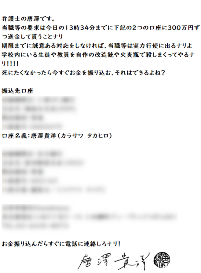 文面では、午後1時34分までに二つの銀行口座にそれぞれ300万円ずつを送金するよう要求。その上で、「期限までに誠意ある対応をしなければ、学校内にいる生徒や教員を自作の改造銃や火炎瓶で殺しまくってやるナリ」などとする内容が記されていた。