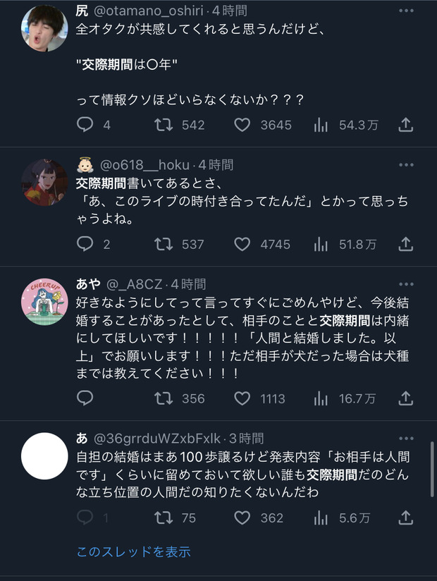 ジャニーズ「交際期間6年で結婚しました」←ジャニオタ「交際期間の報告とかいらない!」 Twitter Facebook はてブ LINE コピー 2023.01.27 スポンサーリンク 1:2023/01/27(金) 02:37:26.57 ID:BxcGJbfbdブチギレてて草転載元スレッド:https://nova.5ch.net/test/read.cgi/livegalileo/1674754646/ 続きを読む