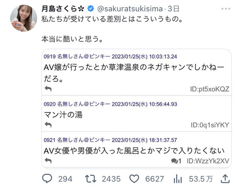 【悲報】セクシー女優さん、Twitterでブチ切れてしまうwwwwwww Twitter Facebook はてブ LINE コピー 2023.01.30 スポンサーリンク 1:以下、5ちゃんねるからVIPがお送りします:2023/01/29(日) 15:12:17.872 ID:MjENSlQa0NIKU 2:以下、5ちゃんねるからVIPがお送りします:2023/01/29(日) 15:13:23.198 ID:izrflpGApNIKU これはキレていいだろ… 3:以下、5ちゃんねるからVIPがお送りします:2023/01/29(日) 15:13:25.562 ID:C+osPCyD0NIKU セクシー女優のツイッター監視してる暇あんなら職探ししろよ 続きを読む
