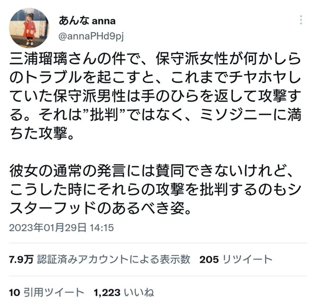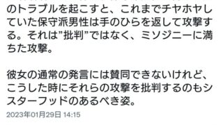三浦瑠璃さんの件で、保守派女性が何かしらのトラブルを起こすと、これまでチヤホヤしていた保守派男性は手のひらを返して攻撃する。それは”批判”ではなく、ミソジニーに満ちた攻撃。