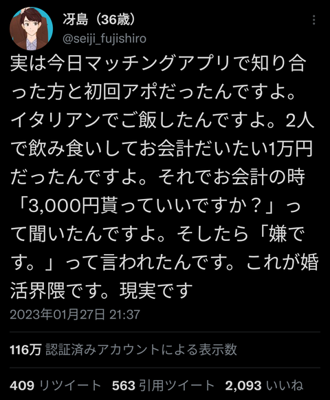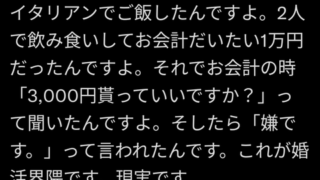 婚活ちんさん「会計1万円だから3000円払ってもらってもいいですか?」婚活まんさん「いやです」 Twitter Facebook はてブ LINE コピー 2023.01.30 スポンサーリンク 1:風吹けば名無し:2023/01/30(月) 13:32:47.00 流石に草 2:風吹けば名無し:2023/01/30(月) 13:33:04.67 会計拒否は大人としてどうよ 続きを読む