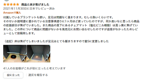 (追記)床は焦げてしまいましたが足元はとても暖まりますので星5に変更しました