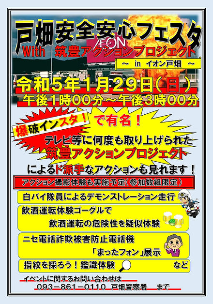 福岡県警のPRイベント「安心安全フェスタ」が29日、戸畑区のイオン戸畑ショッピングセンターであり、屋上駐車場での警察ドラマさながらの爆破演出が約400人の買い物客の目をくぎ付けにした。