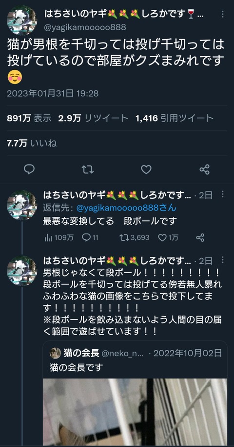 ツイッタラー「猫が男根を千切っては投げ千切っては投げているので部屋がクズまみれです☺」 Twitter Facebook はてブ LINE コピー 2023.02.03 スポンサーリンク 1:以下、5ちゃんねるからVIPがお送りします:2023/02/02(木) 23:58:36.065 ID:4Qa7DbeY0 2:以下、5ちゃんねるからVIPがお送りします:2023/02/03(金) 00:01:23.993 ID:R8xykUeC0 いいね乞食 3:以下、5ちゃんねるからVIPがお送りします:2023/02/03(金) 00:01:34.437 ID:RCWmcpTm0 男根 続きを読む
