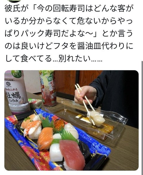 女性「彼氏がパック寿司の蓋を醤油皿にしてた、別れたい……🥺」