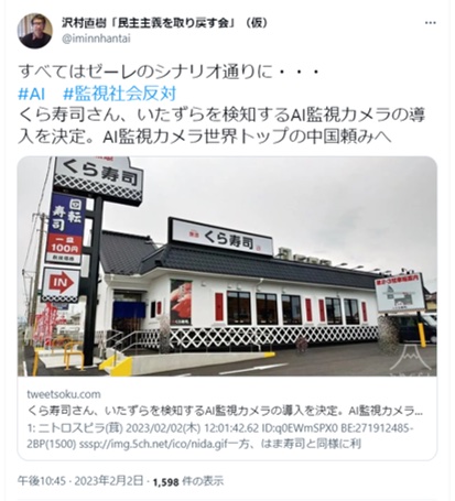 くら寿司「寿司テロ行為防止のために監視カメラ導入します」→???「やっぱりな、監視社会を生み出すための茶番だったんだろ?」 Twitter Facebook はてブ LINE コピー 2023.02.04 スポンサーリンク 1:以下、5ちゃんねるからVIPがお送りします:2023/02/04(土) 12:43:11.855 ID:L+gZaqjGp なんでそんな発想になるんだ… 2:以下、5ちゃんねるからVIPがお送りします:2023/02/04(土) 12:44:13.539 ID:CbCHexWTM 自作自演でガキの人生終わらせんでもいいだろ 続きを読む