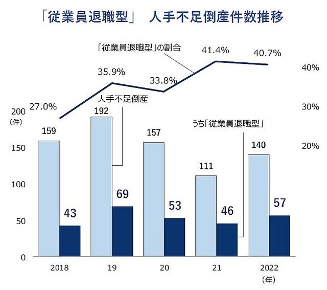 コロナ禍からの経済再開が進むなか、従業員を自社につなぎとめることができずに経営破綻した倒産が足元で増加傾向に転じた。2022年に判明した人手不足倒産140件のうち、従業員や経営幹部などの退職・離職が直接・間接的に起因した「従業員退職型」の人手不足倒産は、少なくとも57件判明した。多くの産業で人手不足感がピークに達した2019年以来、3年ぶりの増加となった。22年の人手不足倒産に占める「従業員退職型」の割合は40.7%となり、21年(46件/111件、41.4%)に続き高水準で推移した。