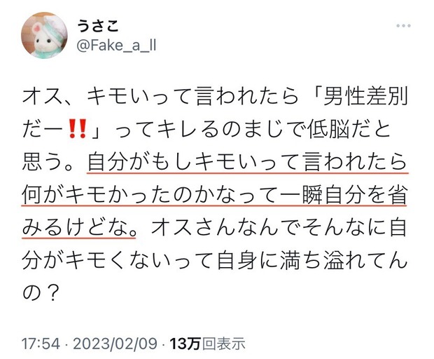 女性さん「オスってなんでキモいって言われて怒るの?女性ならまず何が悪いか自分を省みるのに」 Twitter Facebook はてブ LINE コピー 2023.02.10 スポンサーリンク 1 : それでも動く名無し :2023/02/10(金) 15:16:09.19 ID:yZvLNF6M0なおその後2 : それでも動く名無し :2023/02/10(金) 15:16:31.07 ID:yZvLNF6M0やっぱ女性って男より優れた生き物なんやね転載元スレッド:https://nova.5ch.net/test/read.cgi/livegalileo/1676009769/ 続きを読む