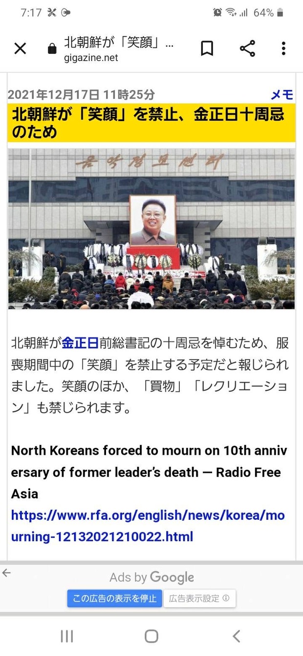 【悲報】 北朝鮮さん、「笑顔」を禁止してしまう Twitter Facebook はてブ LINE コピー 2021.12.18 スポンサーリンク 1 : 風吹けば名無し :2021/12/18(土) 20:16:06.28 ID:RBvtShGU0北朝鮮が「笑顔」を禁止、金正日十周忌のためhttps://gigazine.net/news/20211217-north-koreans-banned-laughing-kim-death/転載元スレッド:https://swallow.5ch.net/test/read.cgi/livejupiter/1639826166/ 続きを読む