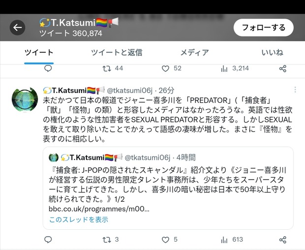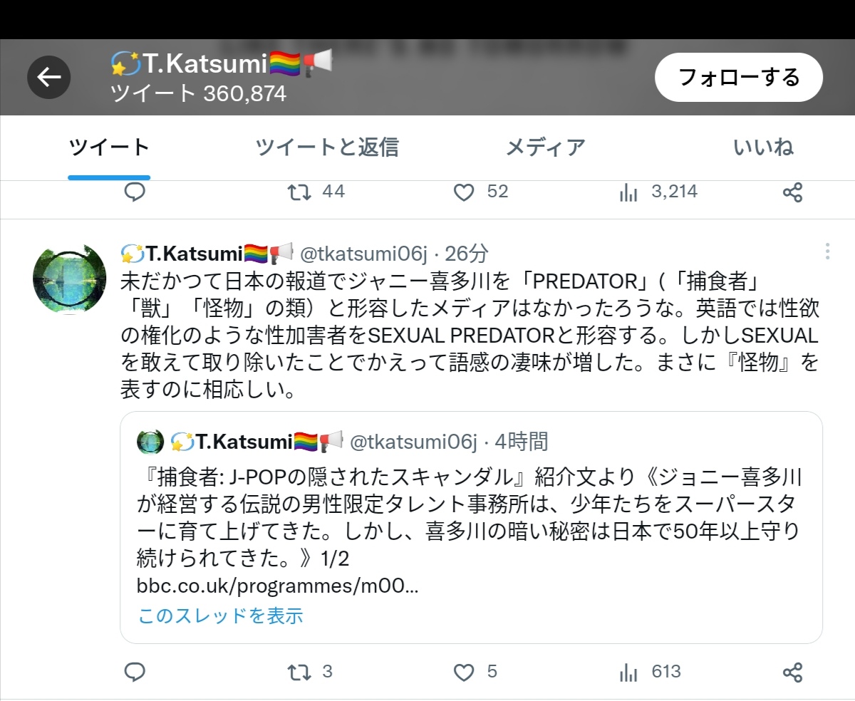 【悲報】ジャニー喜多川の悪事がBBCによって全世界に発信されるwwwwww Twitter Facebook はてブ LINE コピー 2023.02.28 スポンサーリンク 1 : それでも動く名無し :2023/02/28(火) 02:26:33.18 ID:r2rabJPM0https://www.bbc.co.uk/programmes/m001jw7y転載元スレッド:https://nova.5ch.net/test/read.cgi/livegalileo/1677518793/ 続きを読む