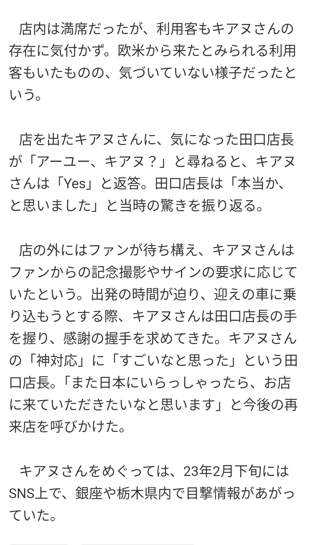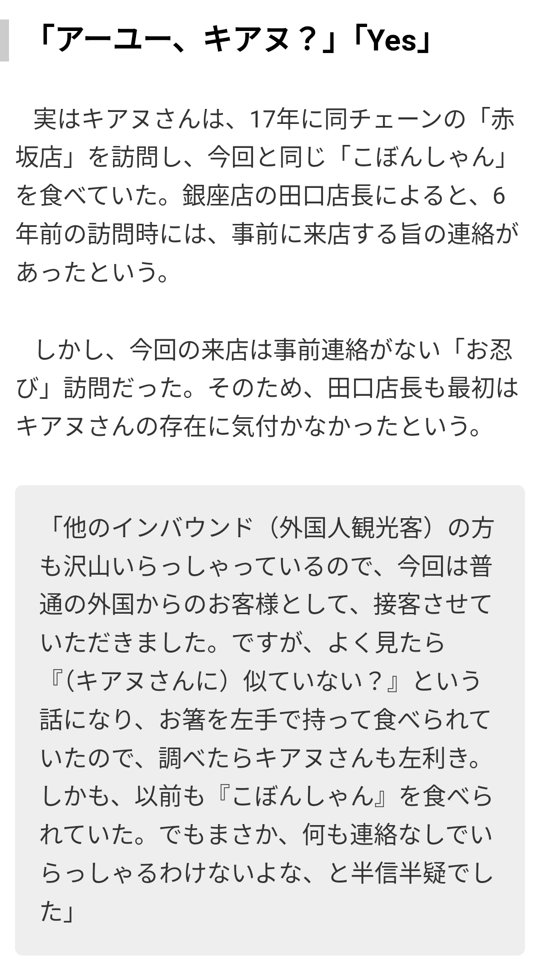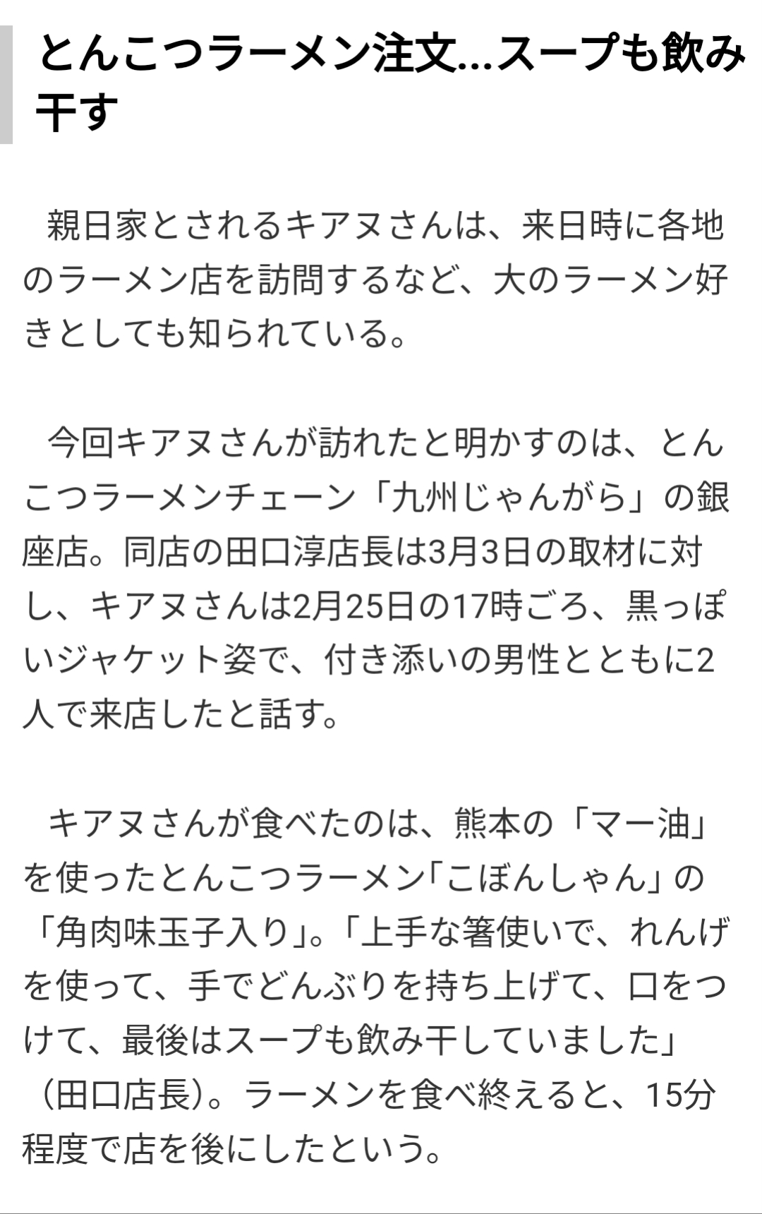 キアヌ・リーブス、銀座のラーメン店を「お忍び訪問」 「まさか連絡なしで...」店長も最初気づかず#キアヌ #キアヌ・リーブス #九州じゃんがら https://t.co/UFrlCZXB8I
