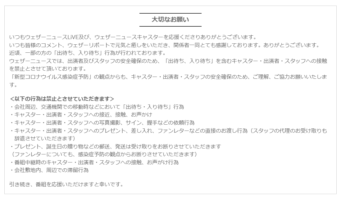 「新型コロナウイルス感染症予防」の観点からも、キャスター・出演者・スタッフの安全確保のため、ご理解、ご協力お願いいたします。