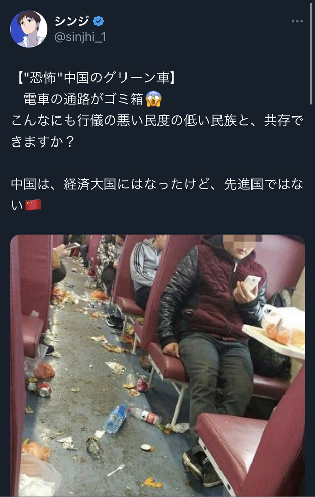【悲報】中国のグリーン車、民度がヤバすぎる…こんな連中が日本に大挙して押し寄せる模様 Twitter Facebook はてブ LINE コピー 2023.03.07 スポンサーリンク 1 : それでも動く名無し :2023/03/06(月) 17:35:53.74 ID:Qjt4I4tXr転載元スレッド:https://nova.5ch.net/test/read.cgi/livegalileo/1678091753/ 続きを読む