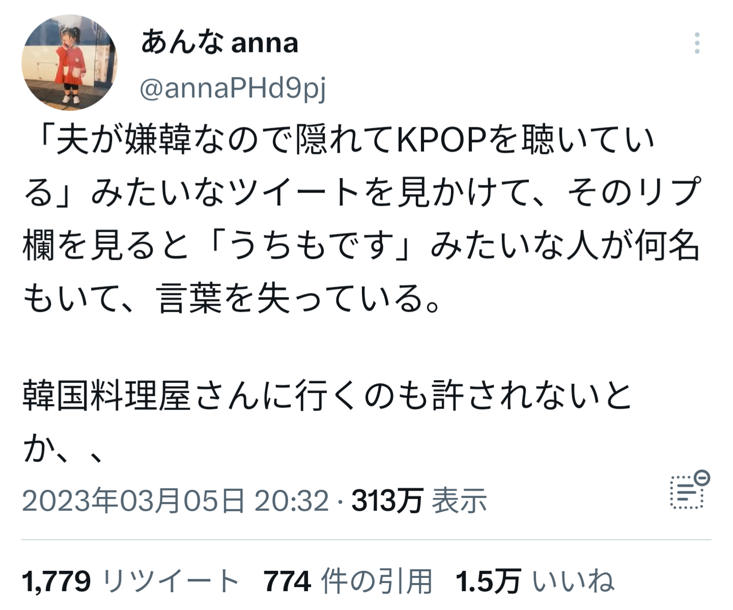 【悲報】女さん「夫が嫌韓なので隠れてKPOPを聴いています。これはレイシズムでありセクシズムです!」 Twitter Facebook はてブ LINE コピー 2023.03.07 スポンサーリンク 1 : それでも動く名無し :2023/03/06(月) 15:27:23.45 ID:ck7iZjcZ02 : それでも動く名無し :2023/03/06(月) 15:27:29.44 ID:ck7iZjcZ0ええんか?3 : それでも動く名無し :2023/03/06(月) 15:27:37.14 ID:ck7iZjcZ0嫁さんが可哀想や4 : それでも動く名無し :2023/03/06(月) 15:28:04.75 ID:ck7iZjcZ0KPOPも聴けないし韓国料理店にも行けないとかなんというミソジニー……転載元スレッド:https://nova.5ch.net/test/read.cgi/livegalileo/1678084043/ 続きを読む