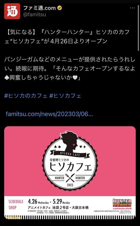 【朗報】ハンターハンターのヒソカ、カフェを開業。その名も「ヒソカフェ」wwwwwwwww Twitter Facebook はてブ LINE コピー 2023.03.07 スポンサーリンク 1:風吹けば名無し:2023/03/07(火) 12:10:26.47 ID:lmwaQ88Da.net 2:風吹けば名無し:2023/03/07(火) 12:11:35.62 ID:OVdZvUVqM.net 飲食店の名前にヒソはあかんやろ 3:風吹けば名無し:2023/03/07(火) 12:12:19.41 ID:F/mYt6iv0.net キャラ単体は無謀やろ 続きを読む