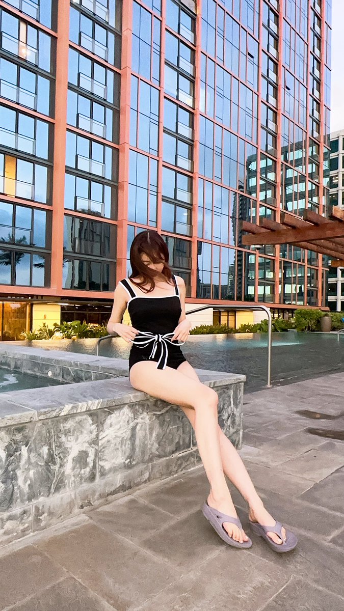 1枚目は黒い水着に白い縁取りがほどこされ、ウエスト部分には大きなリボンが結ばれている上品な水着姿です。
