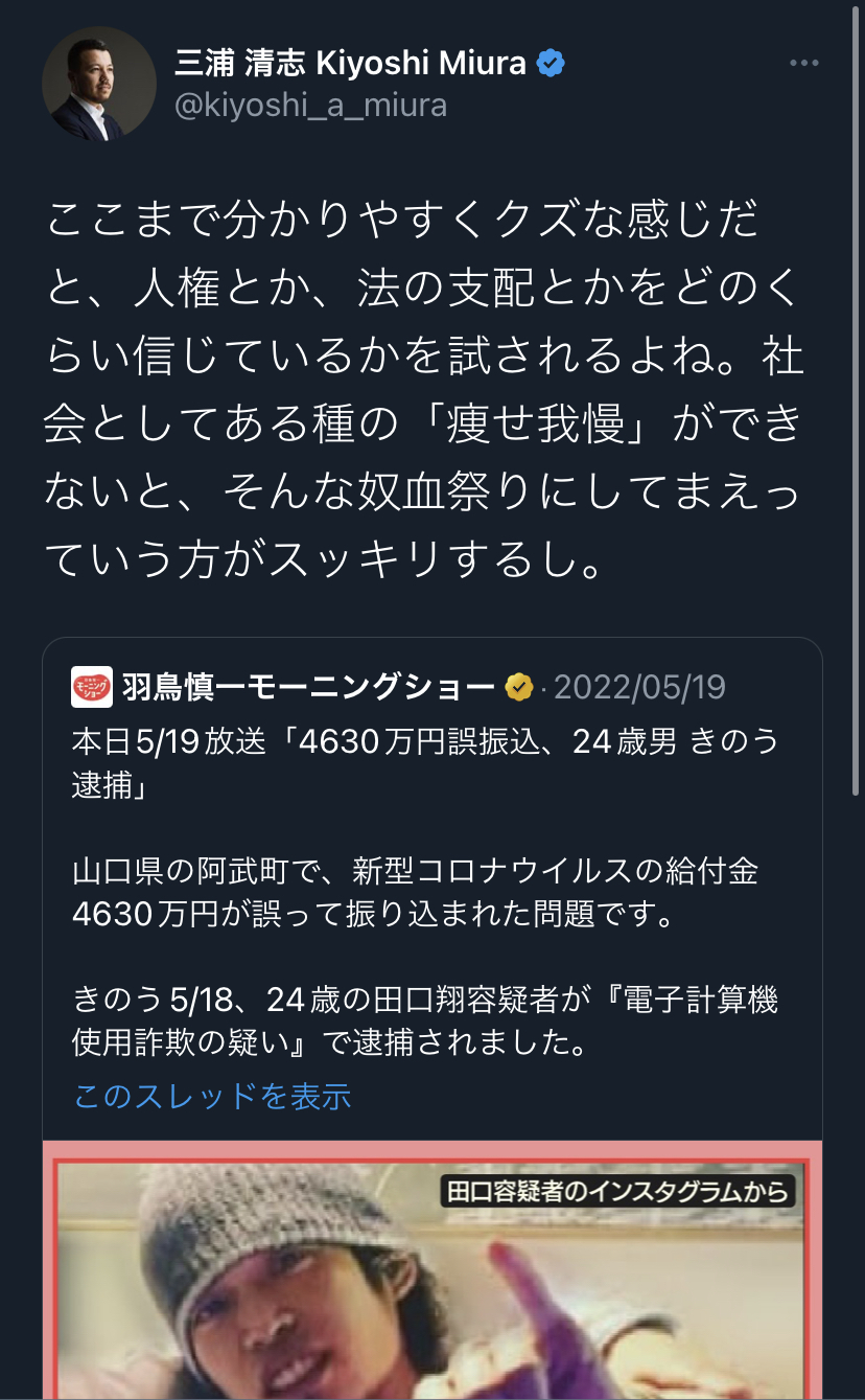 ここまで分かりやすくクズな感じだと、人権とか、法の支配とかをどのくらい信じているかを試されるよね。社会としてある種の「痩せ我慢」ができないと、そんな奴血祭りにしてまえっていう方がスッキリするし。 https://t.co/ML5QEtDY80