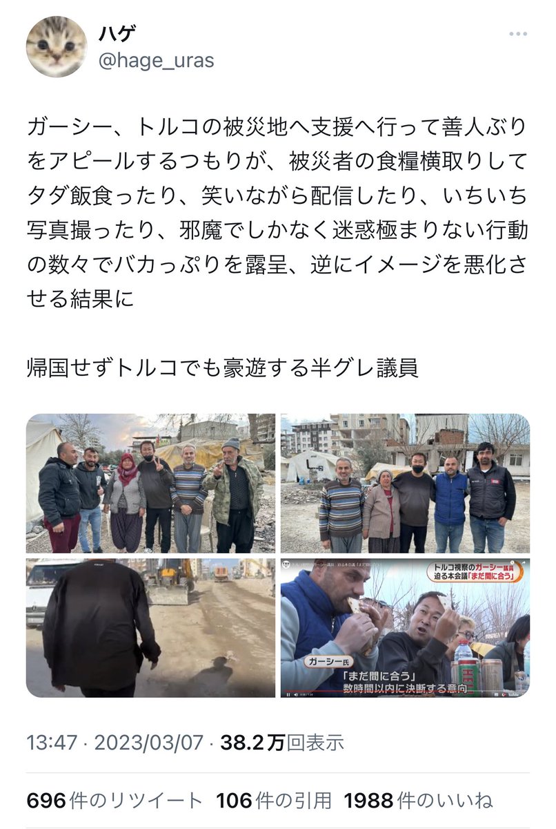 「被災地に物資を運び、元気づけ、握手する。」それ以上のことをガーシー議員はされているんですよね本当に素敵な人