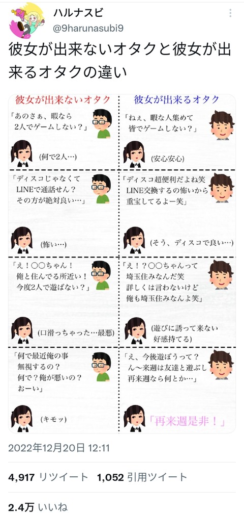 【画像】彼女ができるオタクとできないオタクの違いがコチラ 2.4万いいね Twitter Facebook はてブ LINE コピー 2023.03.08 スポンサーリンク 1:それでも動く名無し:2023/03/08(水) 16:40:54.36 ID:rEMt7XAW0 2:それでも動く名無し:2023/03/08(水) 16:42:11.64 ID:Rc4o0tUR0 これ顔も一緒にした方がいいんちゃうか 4:それでも動く名無し:2023/03/08(水) 16:42:22.09 ID:x0D8ZywCH ライン交換怖いって何? 24:それでも動く名無し:2023/03/08(水) 16:54:50.29 ID:jhyX8qSMp >>4 他のSNSと比較するとLINEはプライベート感強いらしい 続きを読む