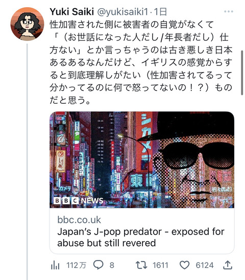 被害者「ジャニーさんには感謝している」BBC「はあっ?何言ってんだ。それおかしいだろジャップ」 Twitter Facebook はてブ LINE コピー 2023.03.09 スポンサーリンク 1:それでも動く名無し:2023/03/09(木) 13:09:23.33 ID:00Hkp6e6d 2:それでも動く名無し:2023/03/09(木) 13:10:14.54 ID:35oD7i0c0 ジャップ土人だからしゃあないんよ 4:それでも動く名無し:2023/03/09(木) 13:10:35.47 ID:PJJowKdP0 でも体育会系って基本こうだよな 続きを読む