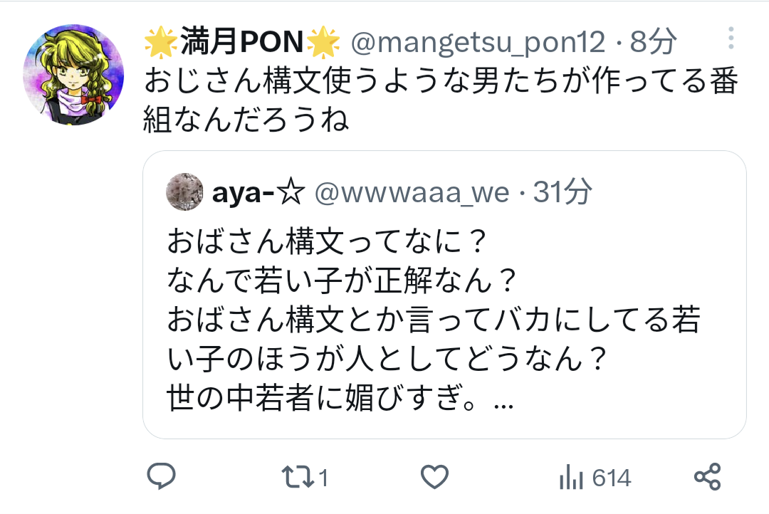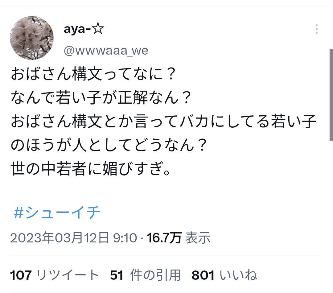 【悲報】テレビで「おばさん構文」特集→ツイッターでおばさんブチギレ Twitter Facebook はてブ LINE コピー 2023.03.12 スポンサーリンク 1: それでも動く名無し 2023/03/12(日) 09:42:52.85 ID:Q1h2rpuA0 10: それでも動く名無し 2023/03/12(日) 09:44:30.30 ID:tsZSPfRGp 効いてて草 16: それでも動く名無し 2023/03/12(日) 09:45:07.15 ID:DFO9LHhH0 シューイチ見たけど審査員があかんわ 22歳ってなんやねん 高校生にやらせろよ 続きを読む