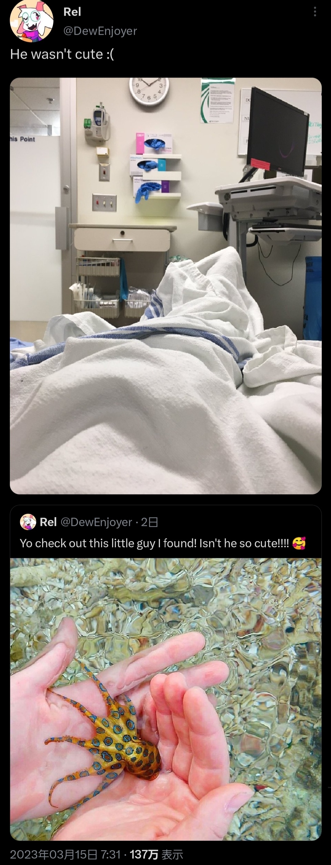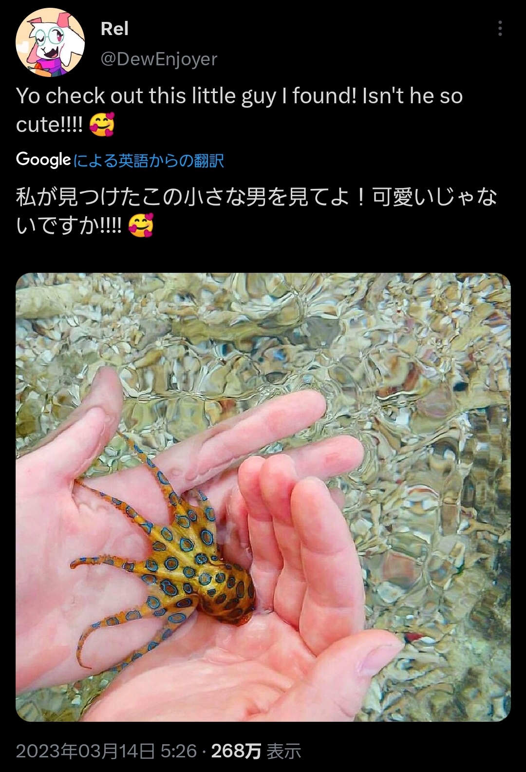 【画像】 人間「見て!めっちゃ可愛いタコ見つけた!」→入院 Twitter Facebook はてブ LINE コピー 2023.03.16 スポンサーリンク 1: 風吹けば名無し 2023/03/16(木) 13:06:51.05 ID:qlWLanQM0 https://twitter.com/DewEnjoyer/status/1635770594942648327 3: 風吹けば名無し 2023/03/16(木) 13:07:50.37 ID:gaCxMnUC0 やべー柄してる時点で触ったらあかんよな 6: 風吹けば名無し 2023/03/16(木) 13:08:28.76 ID:Lvr50A0p0 草 続きを読む