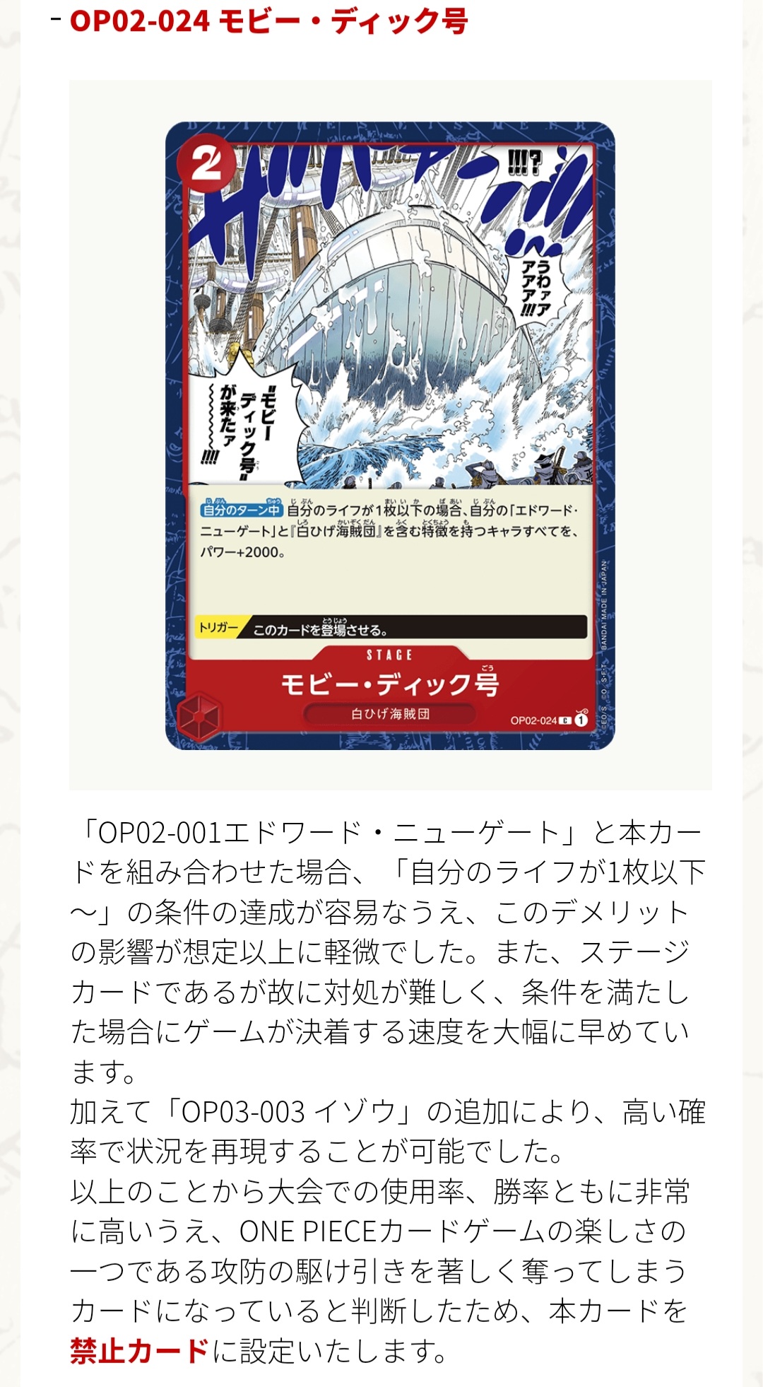 【悲報】ONEPIECEカードゲーム、あのキャラが禁止カードになってしまう… Twitter Facebook はてブ LINE コピー 2023.03.18 スポンサーリンク 1: 風吹けば名無し 2023/03/18(土) 00:55:18.35 ID:ZsysrWvY0 あのカバジとモビーディック号がワンピースカード初の禁止カード 2: 風吹けば名無し 2023/03/18(土) 00:55:55.11 ID:ZsysrWvY0 更にはカバジとセットで活躍していたモージの値段も大暴落した模様 79: 風吹けば名無し 2023/03/18(土) 01:13:13.42 ID:iKSSIHNm0 >>2 暴落ってこんなノーマルっぽいカードに値段つくんかいな 続きを読む