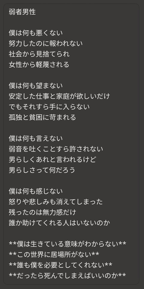 【画像】AIに弱者男性になりきってもらった結果WWWWWWWWWWWWWWWWWW Twitter Facebook はてブ LINE コピー 2023.03.20 スポンサーリンク 1:風吹けば名無し:2023/03/20(月) 19:09:55.40 ID:TLl4FA27r.net 3:風吹けば名無し:2023/03/20(月) 19:10:20.43 ID:TLl4FA27r.net 完全に弱者男性の心情を理解してて草だ 38:風吹けば名無し:2023/03/20(月) 19:19:02.90 ID:mEqgCvye0.net >>3 そら毎日弱者男性と喋ってるからな 続きを読む