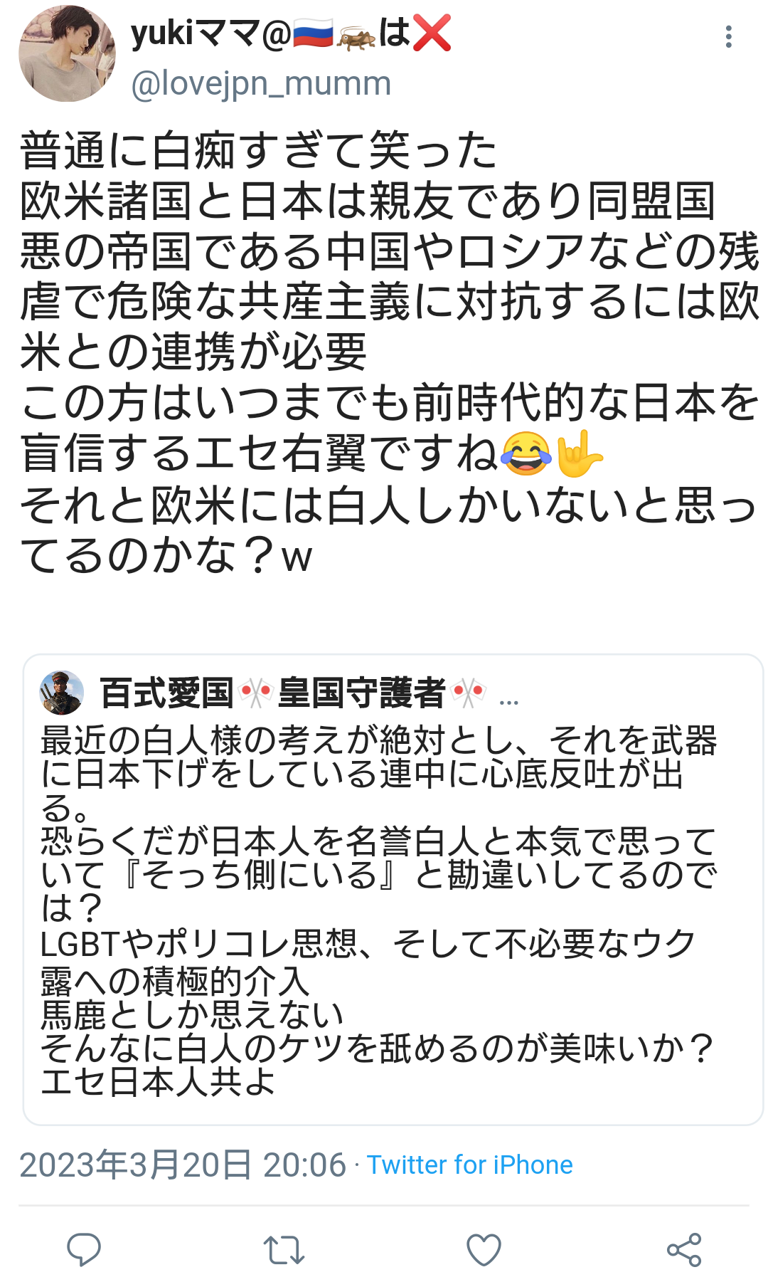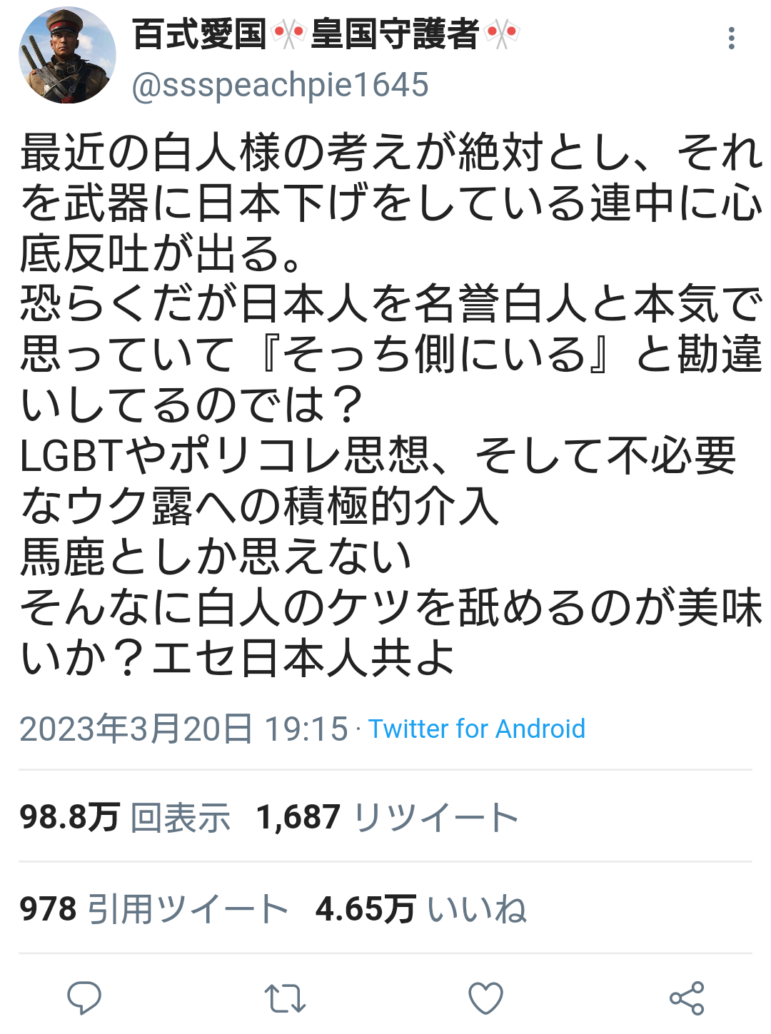 愛国者「白人の考えを絶対とし、それを武器に日本下げをしている連中に心底反吐が出る」4.6万いいね Twitter Facebook はてブ LINE コピー 2023.03.21 スポンサーリンク 1 : 風吹けば名無し :2023/03/21(火) 07:22:03.39 ID:+r54SQMca愛国者様↓それにキレる愛国者様転載元スレッド:https://eagle.5ch.net/test/read.cgi/livejupiter/1679350923/ 続きを読む