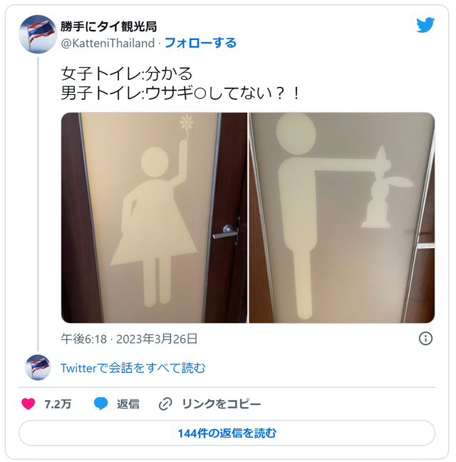 【画像】タイのトイレの男女標識、ヤバすぎて物議wwwww Twitter Facebook はてブ LINE コピー 2023.03.28 スポンサーリンク 1: エファビレンツ(東京都) [CN] 2023/03/28(火) 18:42:27.01 ID:in5IvSIg0● BE:393671931-2BP(2000)【悲報】骨延長のこびさん切断 続きを読む