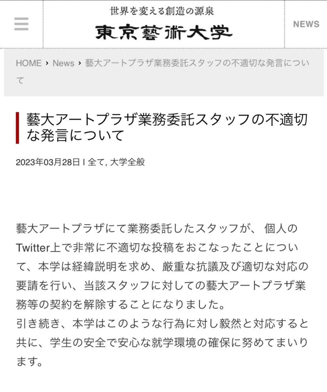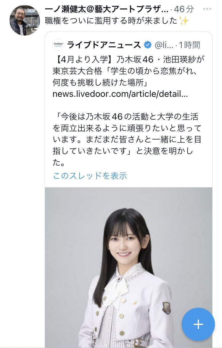 乃木坂46メンバーに職権濫用しようとした東京藝大のスタッフ、クビになる Twitter Facebook はてブ LINE コピー 2023.03.29 スポンサーリンク 1: それでも動く名無し 2023/03/29(水) 00:14:04.26 ID:DUpSYBfD0 https://www.geidai.ac.jp/news/20230328123287.html 4: それでも動く名無し 2023/03/29(水) 00:15:08.65 ID:Ok+8vJEep 早くて草 5: それでも動く名無し 2023/03/29(水) 00:15:11.95 ID:9MXdJgUzp 当然やね 続きを読む