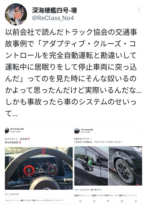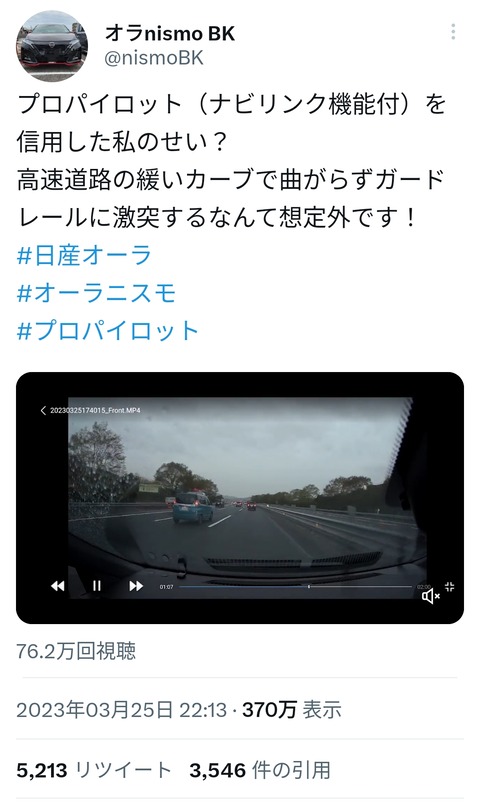 【画像】日産の運転支援システム「プロパイロット」を完全自動運転と勘違いした車カス、無事事故って車のせいにする Twitter Facebook はてブ LINE コピー 2023.03.29 スポンサーリンク 1:以下、?ちゃんねるからVIPがお送りします:2023/03/26(日) 16:52:47.986 やっちゃえ日産 ↓ 続きを読む
